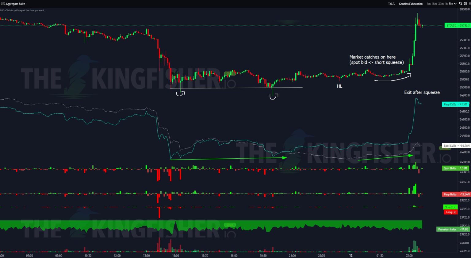 Famend analyst Skew provided a technical perspective on the value motion, referring to it as a “textbook brief squeeze.” Delving deeper into Skew’s evaluation, he identified a transparent divergence within the Cumulative Quantity Delta (CVD) of perpetual contracts (or “perps”) with the precise value. In buying and selling, a divergence between CVD and value can sign a possible reversal. On this context, whereas sellers had been attempting to push the value beneath $25,000, the CVD indicated that purchasing stress was mounting.