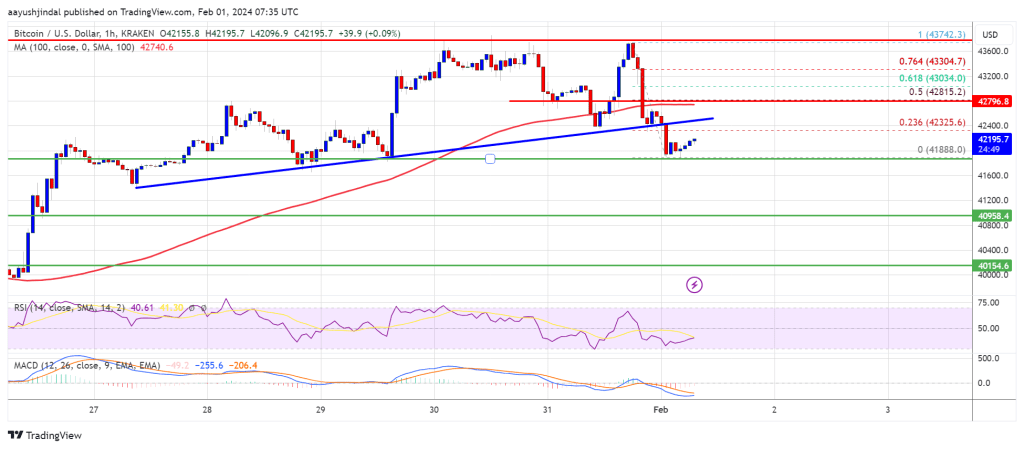 If Bitcoin fails to rise above the $42,800 resistance zone, it might proceed to maneuver down. Quick help on the draw back is close to the $41,800 degree.
