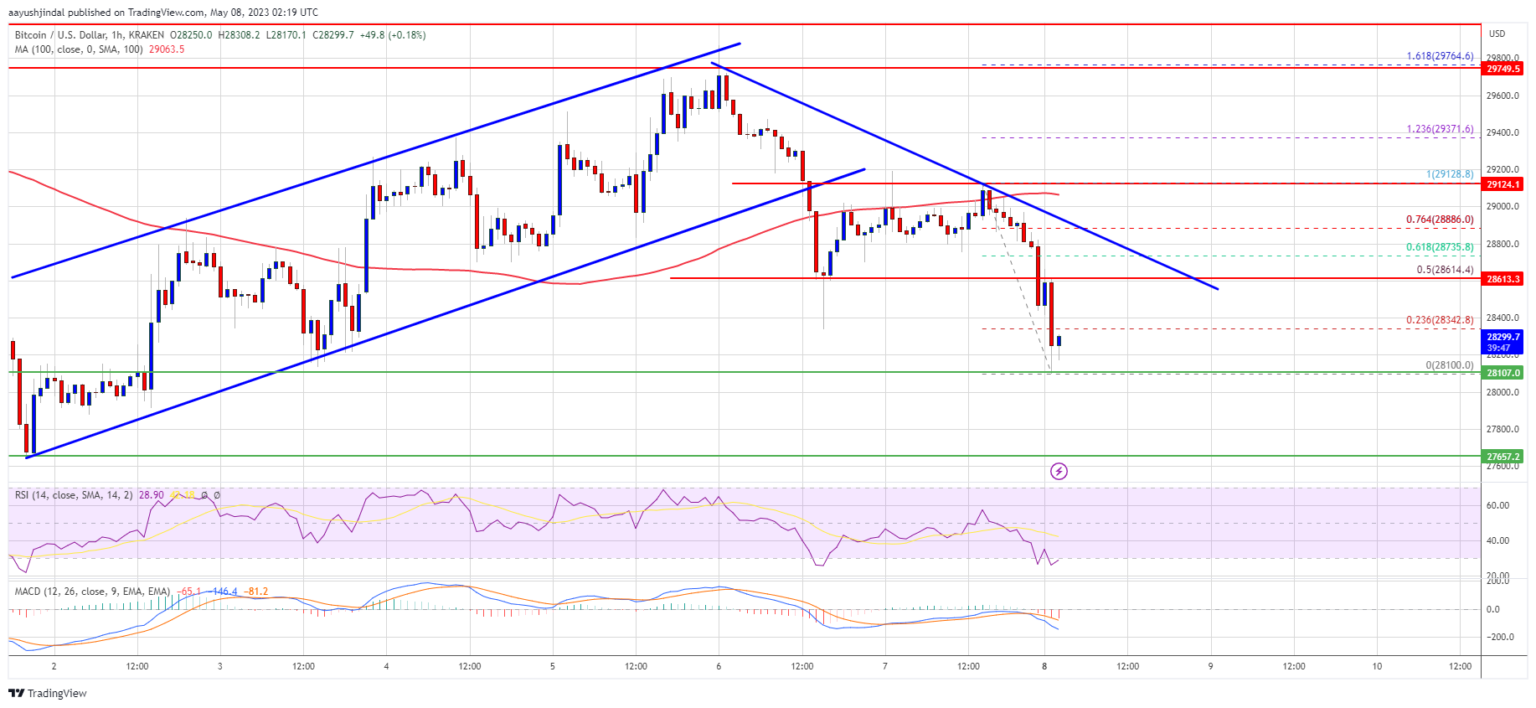 It traded near the $28,000 assist. A low is shaped close to $28,100 and the value is now consolidating losses. It’s now buying and selling beneath $28,800 and the 100 hourly Easy transferring common. There may be additionally a key bearish development line forming with resistance close to $28,650 on the hourly chart of the BTC/USD pair.