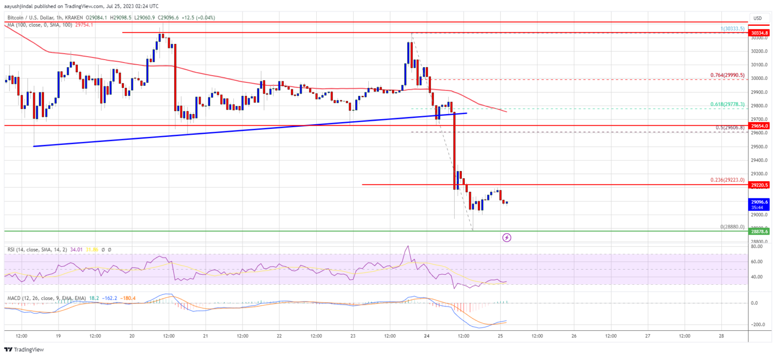 Apart from, there was a break beneath a significant bullish pattern line with help close to $29,700 on the hourly chart of the BTC/USD pair. The pair examined the $28,880 degree. A brand new weekly low is fashioned close to $28,880 and the worth is now consolidating losses.