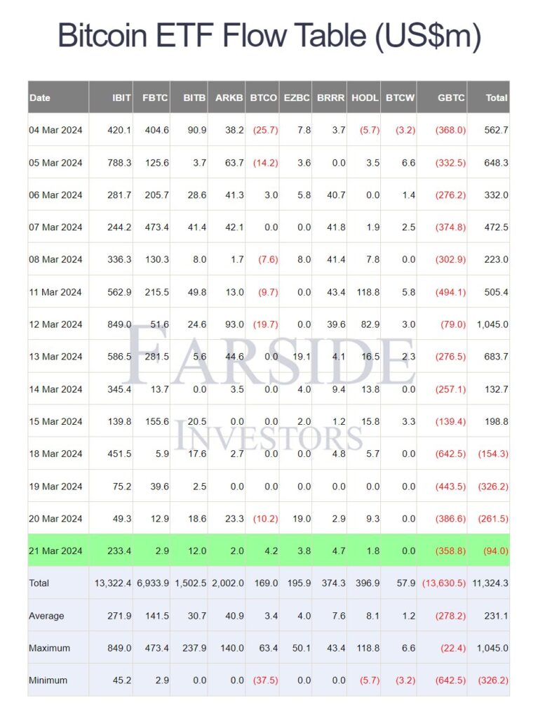 Regardless of a steady four-day streak of internet outflows from Bitcoin spot exchange-traded funds (ETFs) totaling $93.85 million, the Bitcoin value has impressively climbed to reclaim the $66,000 mark. In accordance with information from Farside Buyers, Grayscale ETF GBTC skilled a major outflow yesterday, with a single-day internet outflow of $358 million, culminating in a historic internet outflow of $13.63 billion for GBTC alone.