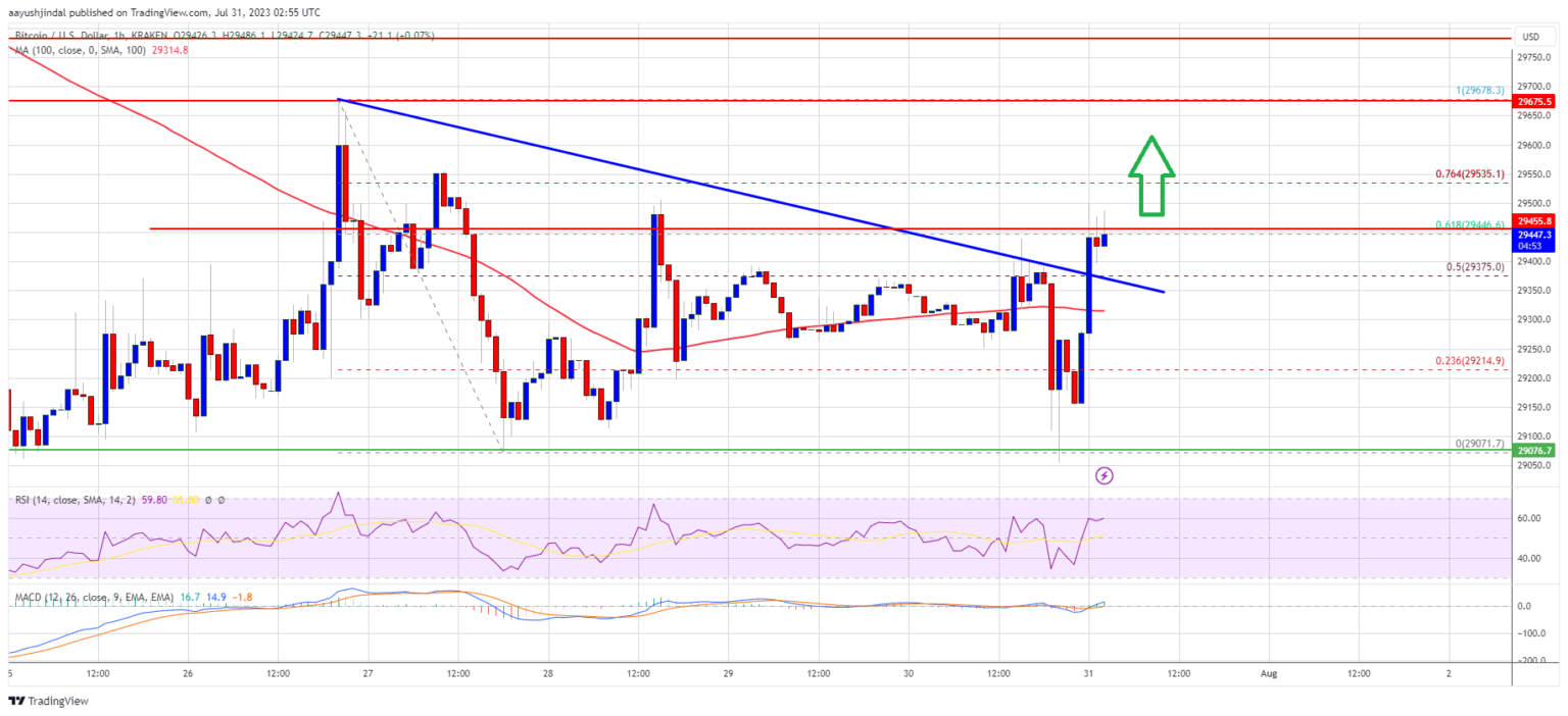 There was a transparent transfer above the $29,250 and $29,300 ranges. The worth broke the 50% Fib retracement stage of the downward transfer from the $29,678 swing excessive to the $29,070 assist. In addition to, there was a break beneath a key bearish development line with resistance close to $29,375 on the hourly chart of the BTC/USD pair.