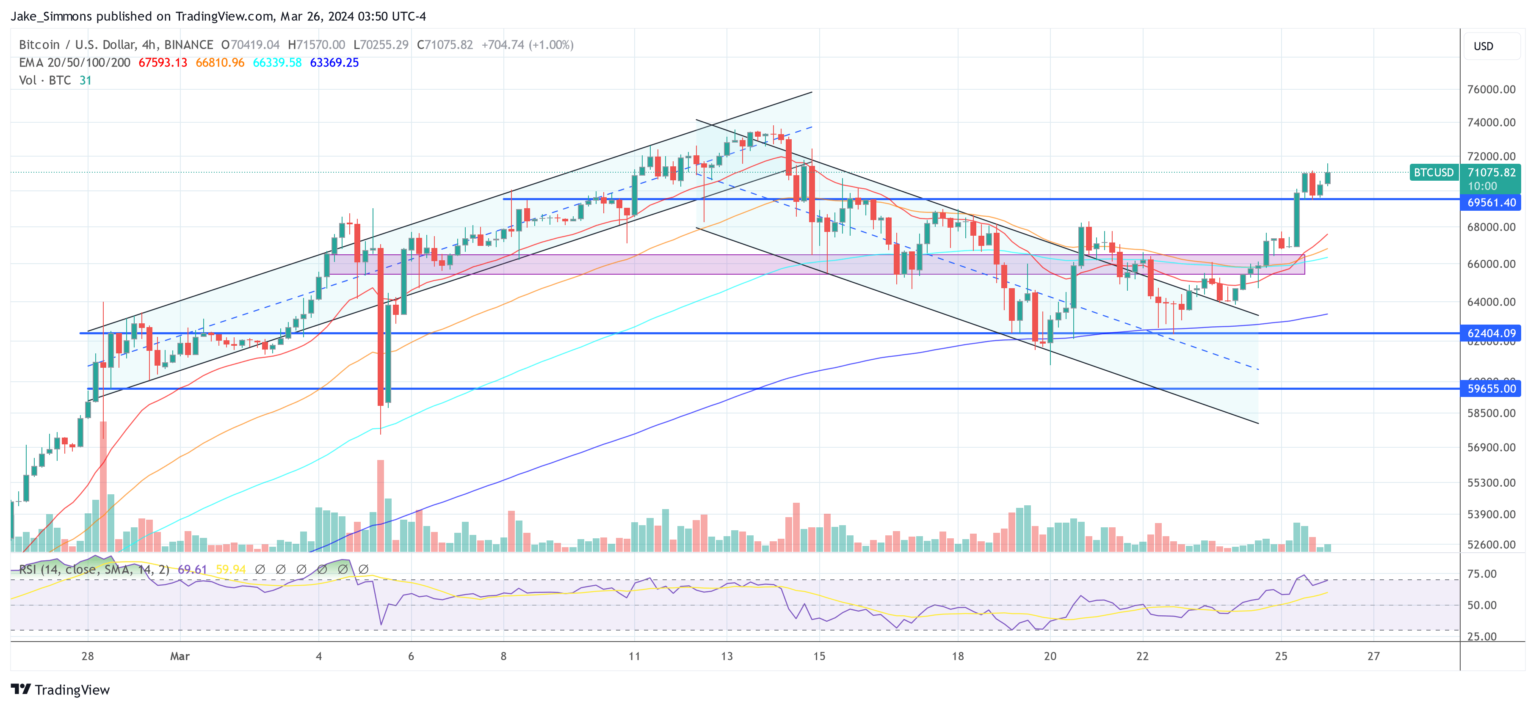 From a technical perspective, Bitcoin’s worth breakout from a descending parallel pattern channel on the 4-hour chart marked a vital turning level. The profitable retest of the robust resistance zone (pink zone) has confirmed the breakout’s legitimacy, resulting in a greater than 7% improve in Bitcoin’s worth. This technical motion has bolstered the boldness of merchants and traders alike, contributing to the momentum that has pushed the value previous the $70,000 threshold.
