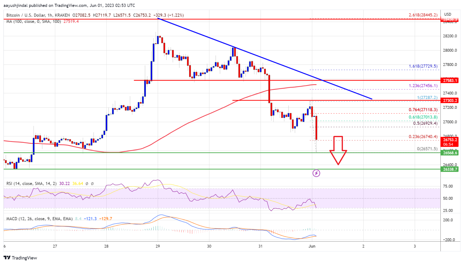 There was a transparent transfer under the $27,400 degree and the 100 hourly Easy shifting common. The worth even dived under the $27,000 degree and traded near the $26,500 assist. A low is fashioned close to $26,571 and the worth is now consolidating losses.