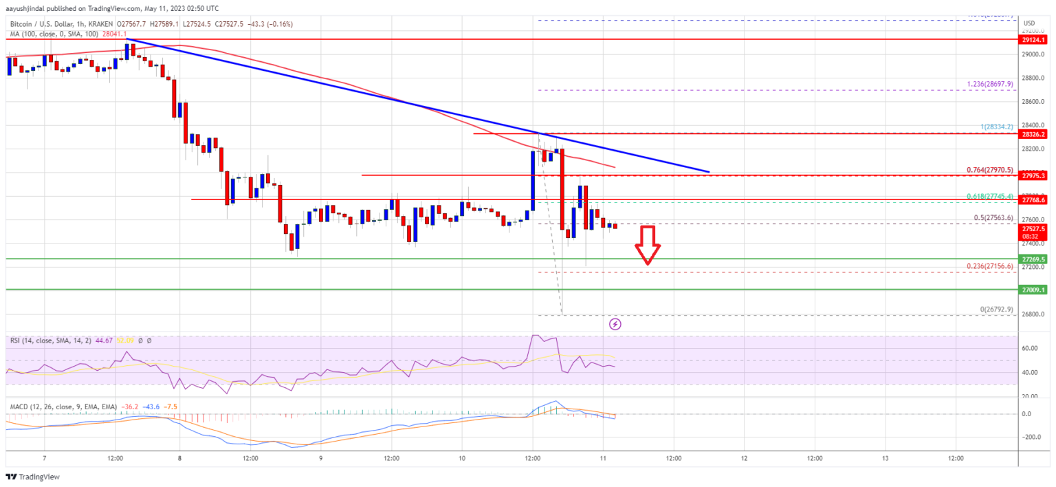 Nevertheless, the bears had been energetic above the $28,200 resistance. A excessive was shaped close to $28,334 and the value tumbled to $27,000. A low is shaped close to $26,792 and the value is now consolidating. It’s buying and selling close to the 50% Fib retracement degree latest decline from the $28,334 swing excessive to the $26,792 low.