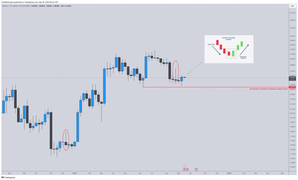 Credible Crypto’s prediction comes after BTC’s robust efficiency final week. In response to the analyst, Bitcoin printed a bullish engulfing candle the earlier week, a technical sample which will sign the beginning of an uptrend.