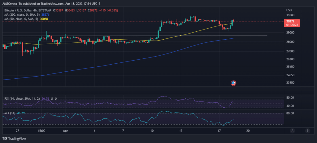 Bitcoin traded at $30,272 at press time. Its one-day worth chart confirmed that it maintained relative energy above the 50% Relative Energy Index (RSI) degree.