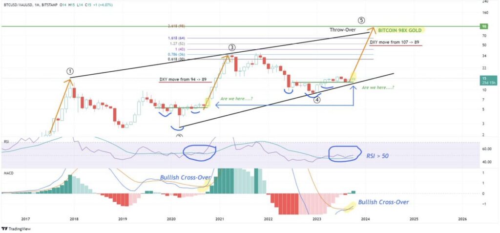 Wanting on the analysts’ chart, they predict the BTC/XAU buying and selling pair, which is the value of Bitcoin per ounce of gold, will soar to 98x the value of gold by early 2024 after finishing the fifth wave of the Elliot Wave sample (marked 1, 2, 3, 4, 5).