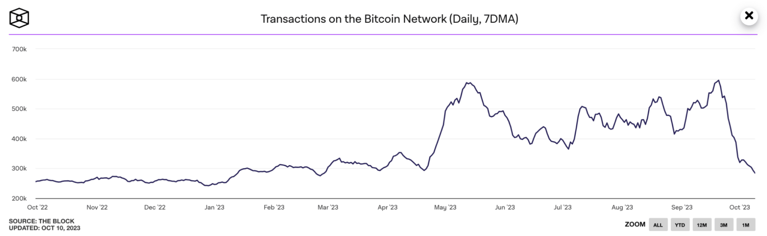 After a surge in September, the variety of each day transactions on the Bitcoin [BTC] community has been on a downward development because the begin of October, based on data retrieved from The Block Knowledge.