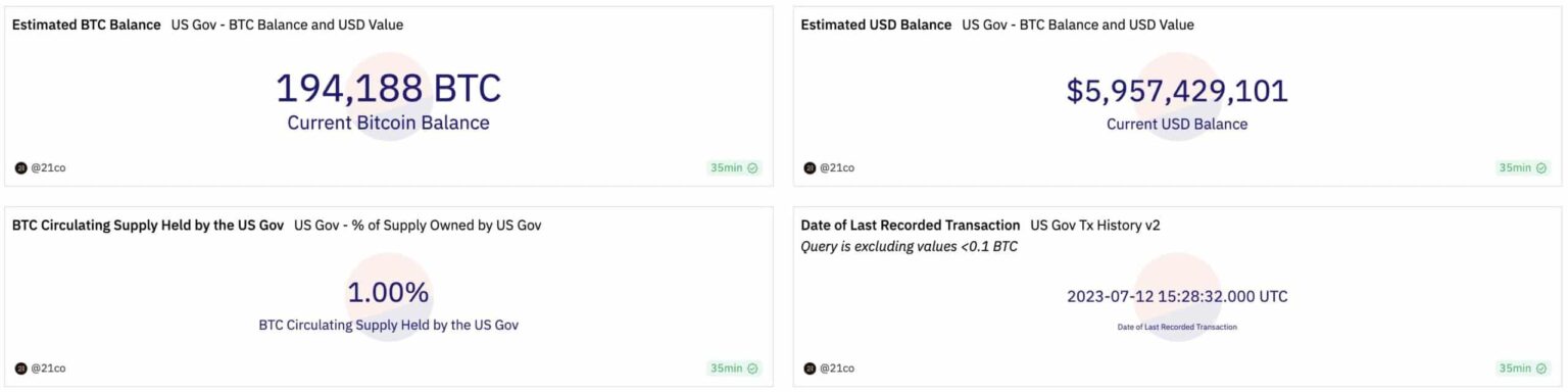 As of in the present day, the USA Authorities possesses an estimated Bitcoin steadiness of 194,188 BTC, valued at roughly $5.96 billion. This quantity accounts for roughly 1% of Bitcoin’s circulating provide.