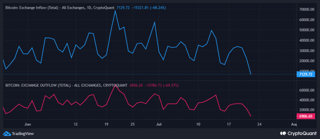 It seems that BTC flows out of exchanges have additionally been affected. BTC alternate outflows are all the way down to a 2-month low.