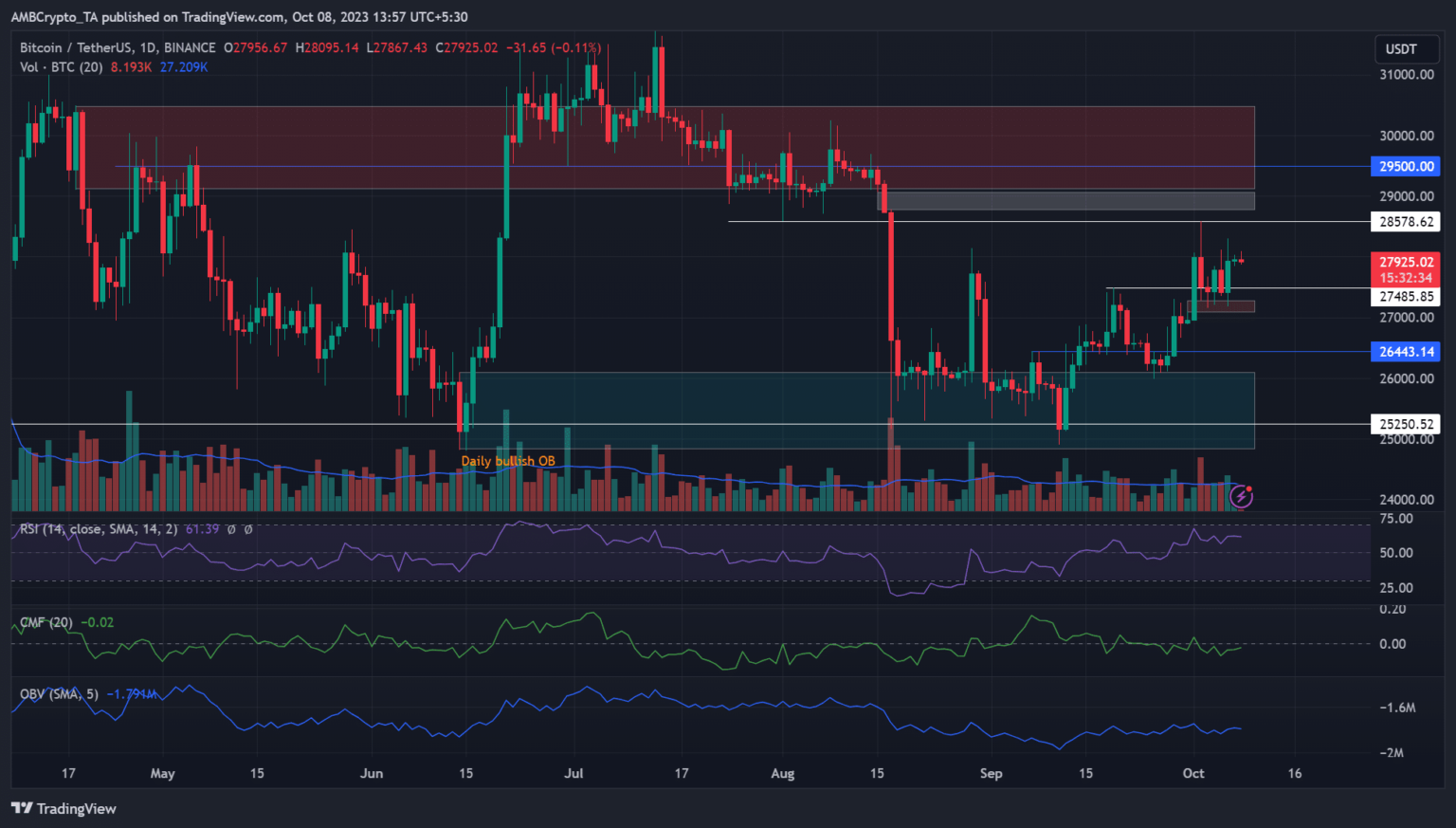 Any drop beneath the world ($27k) might weaken BTC to $26.4k or every day bullish OB, particularly if the September CPI favor sellers.
