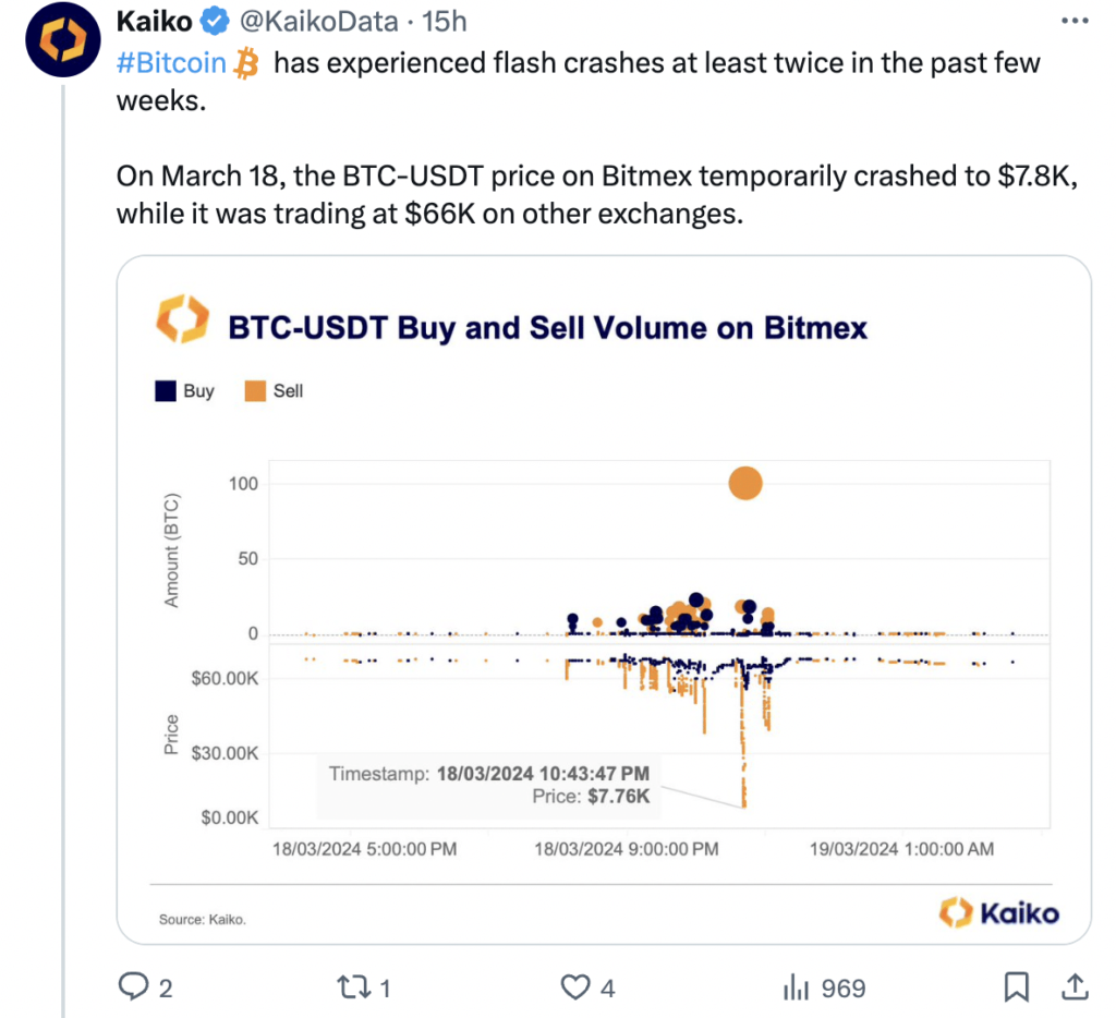 - A number of flash crashes for BTC occurred throughout centralized exchanges.