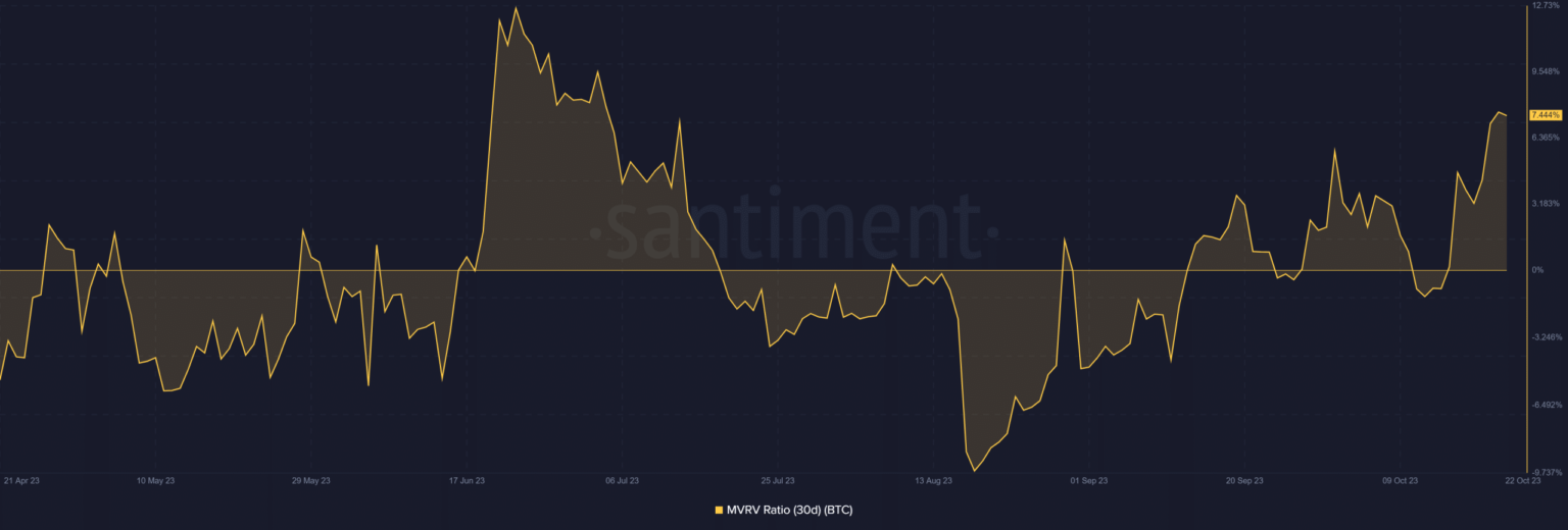 Bitcoin’s MVRV ratio places into perspective the extent of profitability amongst Bitcoin holders. This metric has been inching nearer to its 7-month excessive. It has been steadily rising for the final two months.