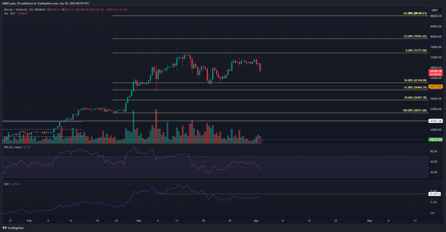 On the 12-hour chart, the market construction was nonetheless bullish. A fall under $60.7k will flip the construction bearishly. The Fibonacci retracement ranges highlighted the $55.5k and $59.4k as crucial ranges.