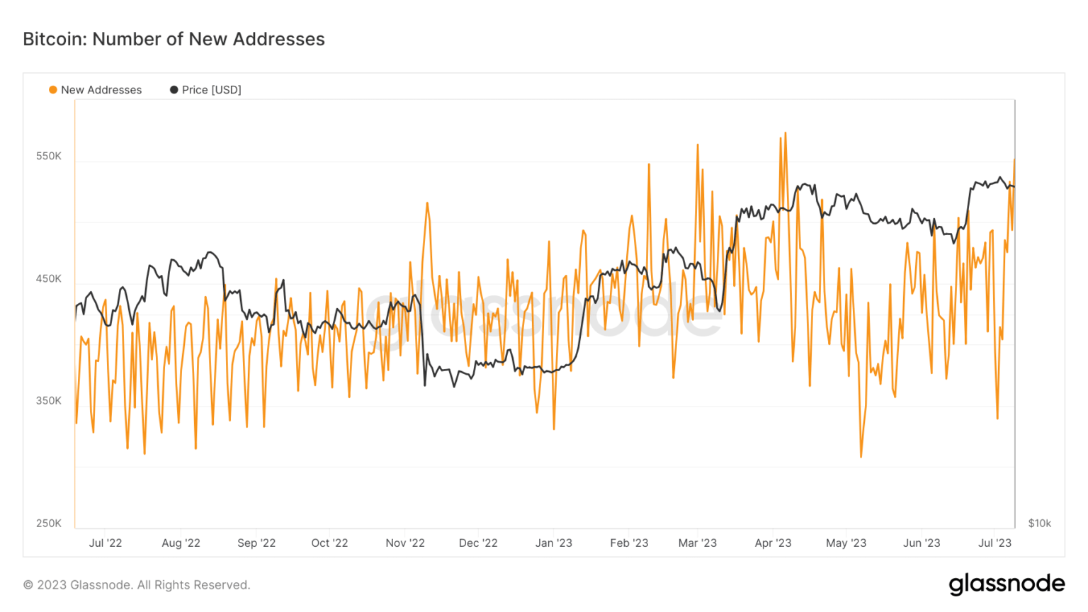 Bitcoin has been making waves recently, attracting appreciable consideration and drawing in lots of customers. Latest information from Glassnode revealed a notable surge in new addresses on the Bitcoin community. This surge was significantly important because the final time it was noticed was again in April. As of this writing, roughly 551,000 new addresses have been registered.