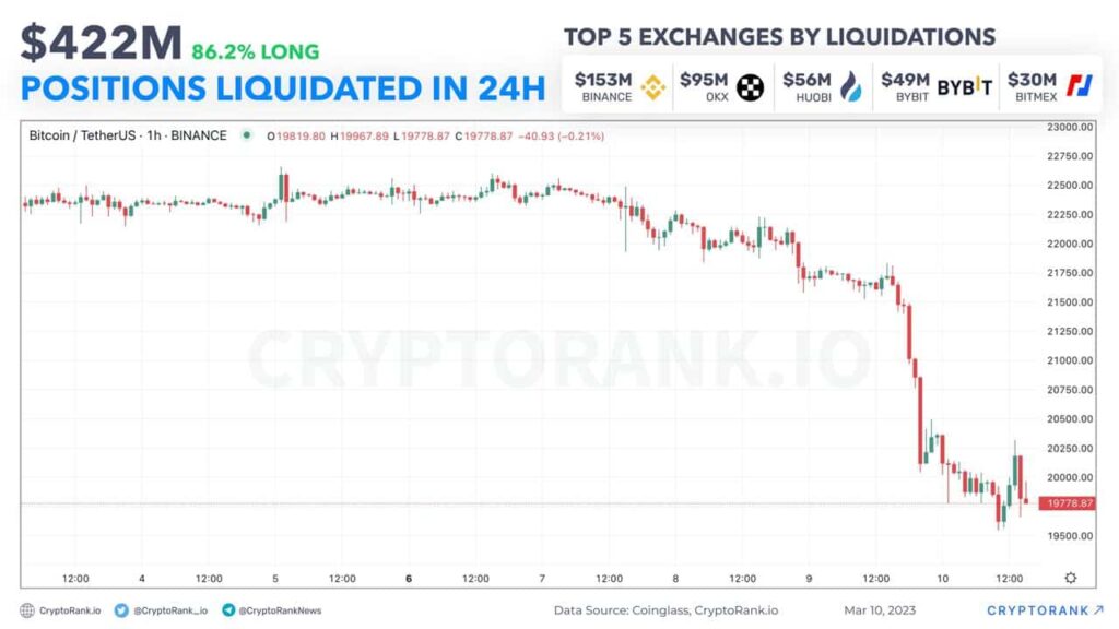 Within the early buying and selling hours of 10 March, Bitcoin [BTC] traded momentarily beneath the $20,000 worth degree for the primary time in seven weeks, inflicting market-wide liquidations.