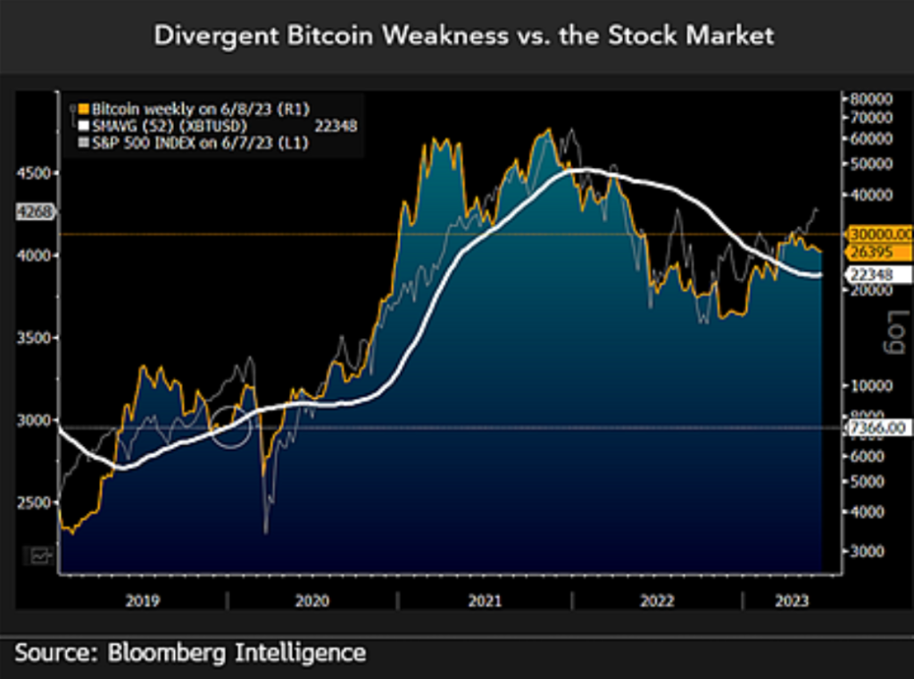 McGlone tells his 58,000 Twitter followers that he thinks Bitcoin is in a poor technical place because it continues to edge downward regardless of the current energy within the inventory market.