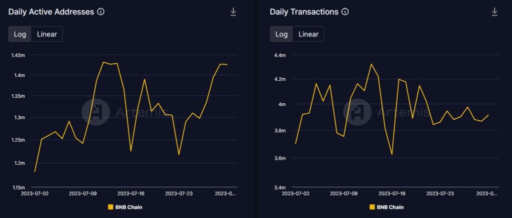 The excellent news was that this was not the case with BNB Chain, as its fundamentals remained robust. Artemis’ chart revealed that regardless of the assault, BNB’s day by day lively addresses registered an uptick. Its day by day transactions additionally moved up barely. Nonetheless, the community’s TVL witnessed a slight decline on 31 July 2023.