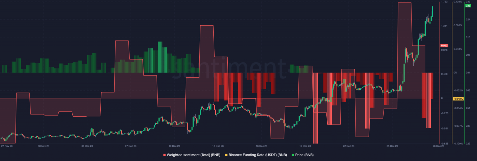 Regardless of the value improve, merchants are bearish on the Binance Coin. In keeping with Santiment’s information, BNB’s Funding Charge was -0.048%. Likewise, its Weighted Sentiment additionally dropped to 0.953.