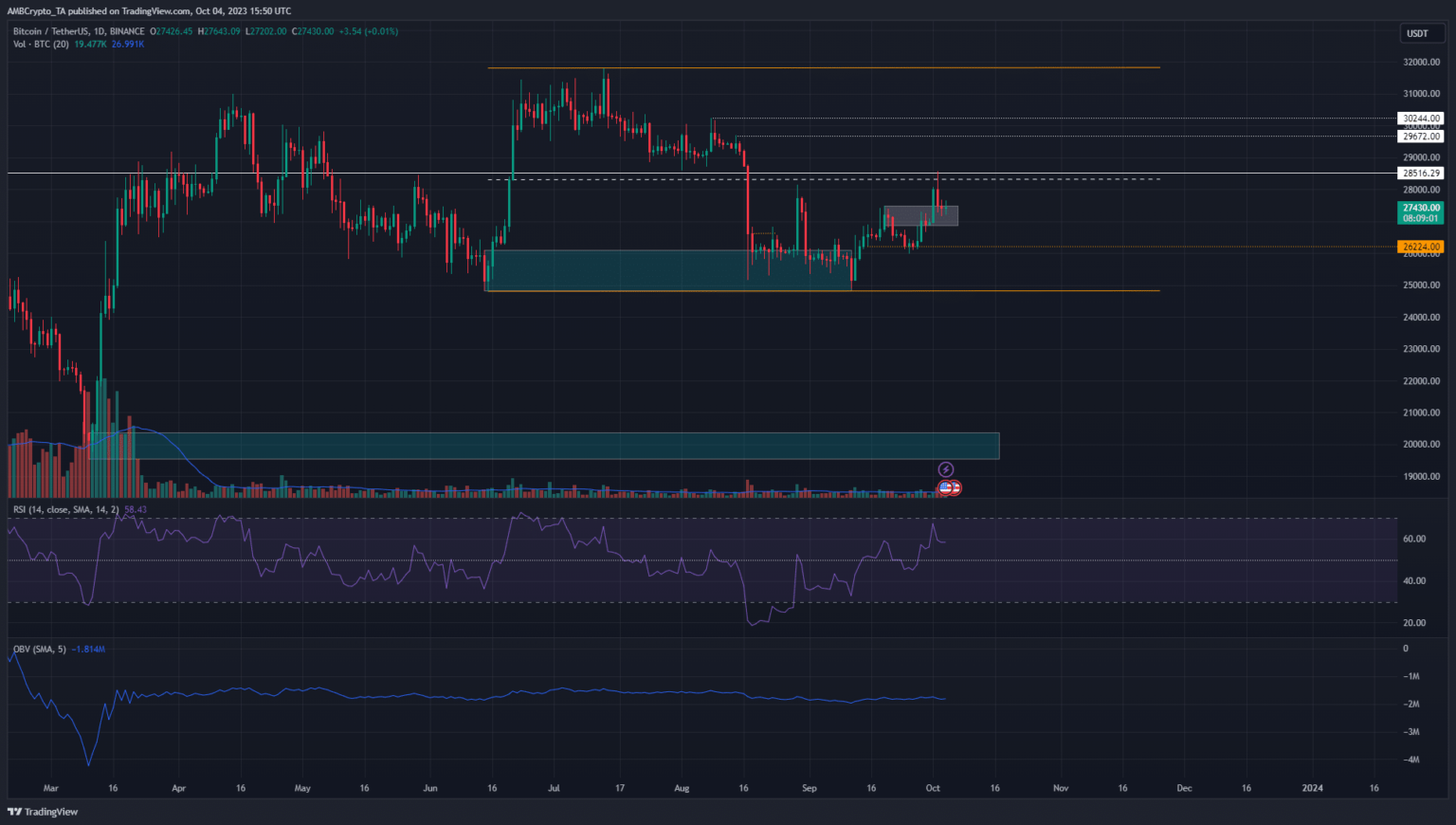 Bitcoin [BTC] appeared to alter its fortunes over the previous three weeks. The drop to the vary low of $24.9k on 11 September was adopted by a rally that reached the mid-range resistance at $28.5k. The market construction was bullish on the 1-day chart- however can the bulls maintain this stress?