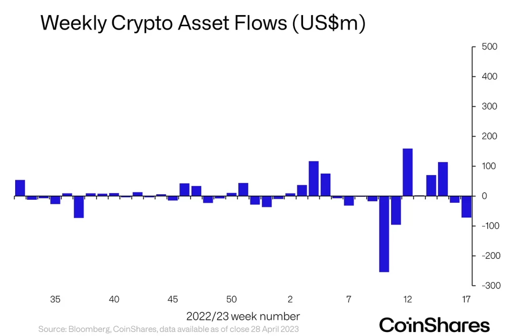 Outflows during the last week elevated to $72 million from $30 million every week earlier than, as bearish sentiment lingered out there. The rate of interest hike was anticipated on the Federal Reserve’s coverage assembly on 3 Might.