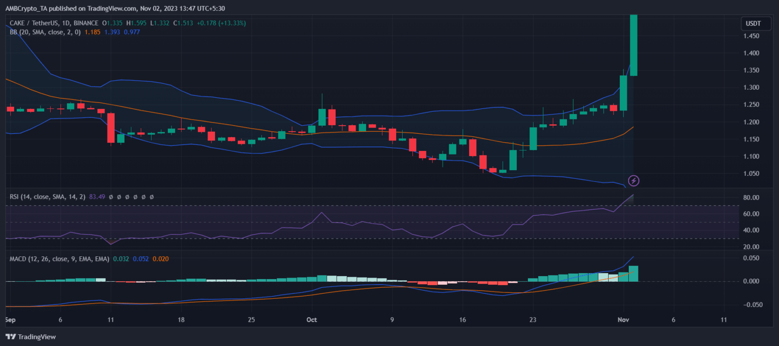 As per CoinMarketCap, in simply the final 24 hours, CAKE’s worth surged by greater than 25%. On the time of writing, CAKE was buying and selling at $1.54 with a market capitalization of over $348 million, making it the 107th largest crypto.