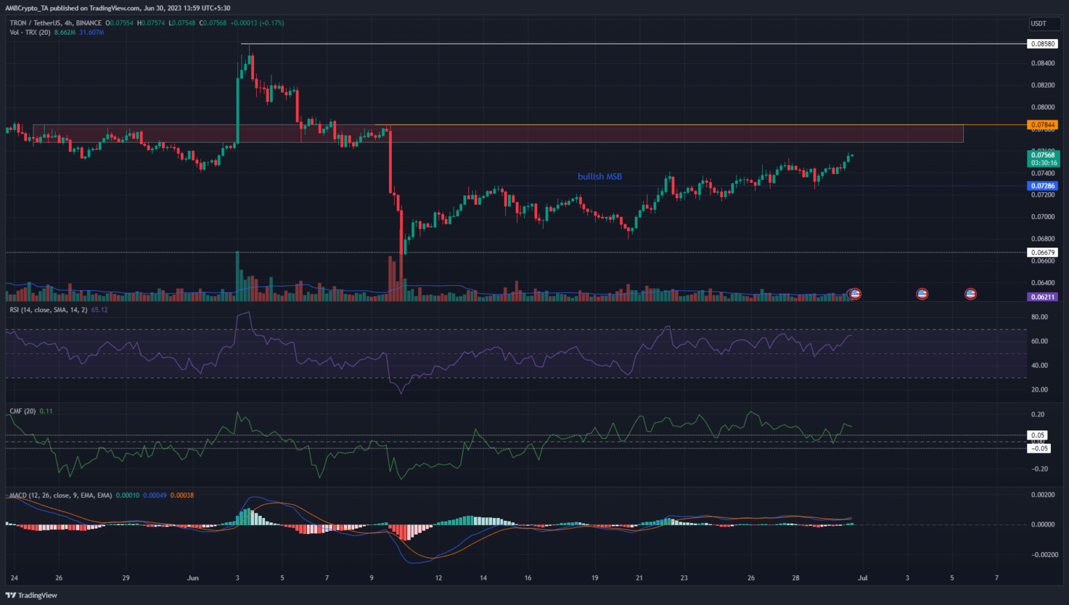 The H4 chart of TRX confirmed a bullish market construction after the value breached the decrease excessive at $0.0728. This occurred on 22 June. Since then, TRON has registered a sequence of upper lows and better highs on the chart, indicating an uptrend prior to now week.