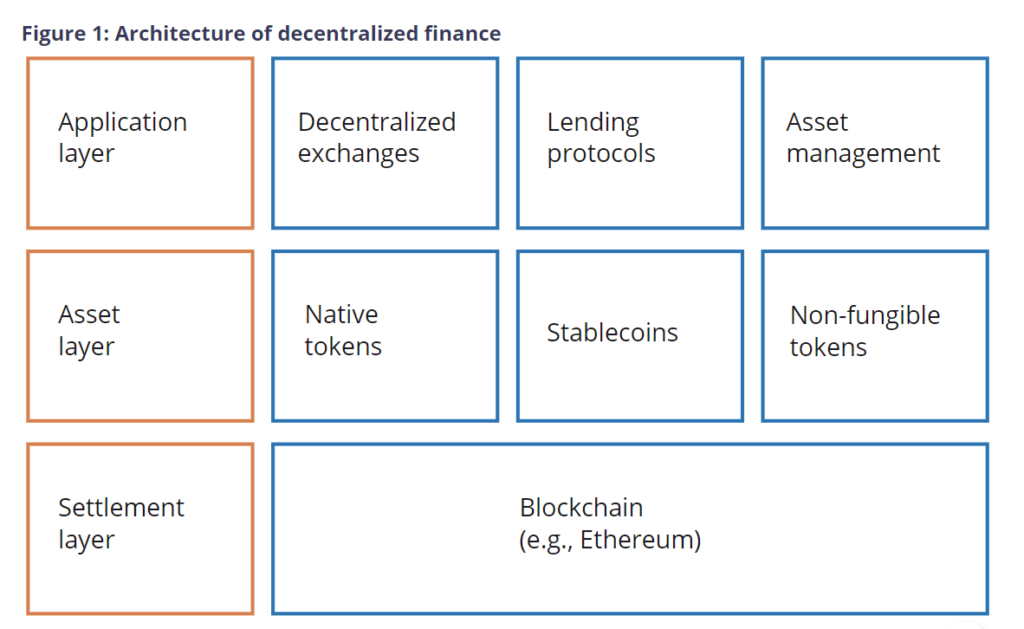 The workers word described DeFi as a multi-layered construction, with the Ethereum blockchain serving as the underside layer (or settlement layer). Builders assemble quite a lot of instruments and providers on prime of the primary blockchain, together with tokenization, lending and borrowing providers, and rather more.