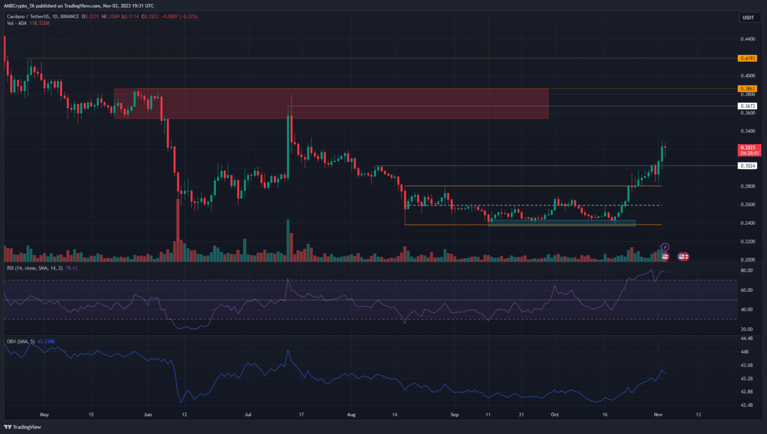 The worth chart of ADA revealed a breakout previous a decrease timeframe vary and a subsequent retest as assist. This was at $0.28, and the value stood at $0.322 at press time.