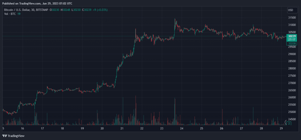 These current BTC ETF filings have created a buzz, with the bulls again to the buying and selling scene. At press time, BTC was buying and selling at a little bit above $30,000. The token mirrored a surge of 20% inside a fortnight.