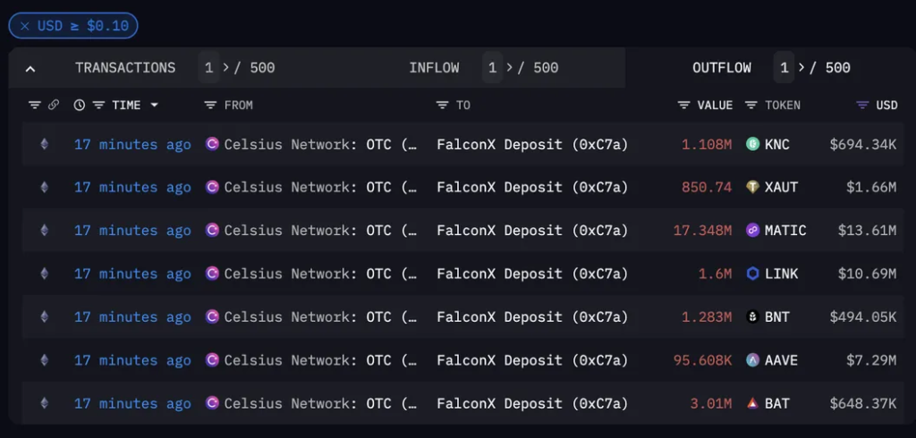 Celsius Community, a bankrupt crypto lending platform, has made a major transfer within the crypto market. Early on Monday, the corporate transferred a complete of $59.4 million in numerous cryptocurrencies to FalconX, a widely known institutional crypto alternate. This motion, which was given the inexperienced gentle by a U.S. chapter court docket late final month, is imagined to be a strategic transfer to alternate these altcoins for Bitcoin (BTC) and Ethereum (ETH).