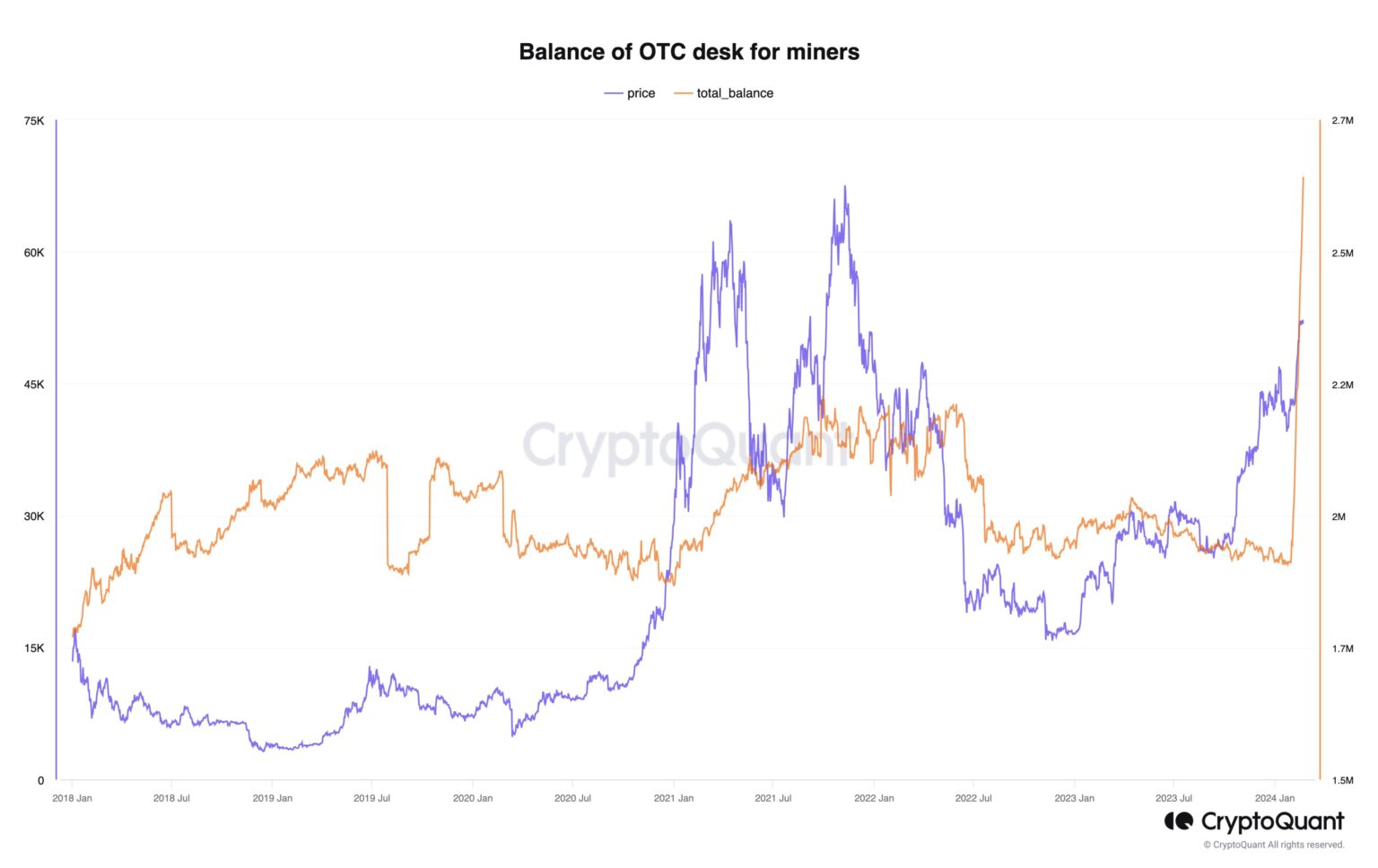But, CryptoQuant CEO Ki Younger Ju could now have discovered the “actual” motive that has had an excellent greater affect on Bitcoin’s worth motion in current weeks. Ju’s evaluation highlights the switch of over 700,000 BTC to Over-The-Counter (OTC) desks predominantly utilized by miners within the weeks succeeding the spot Bitcoin ETF approvals—an equal of roughly $35.6 billion at present costs.