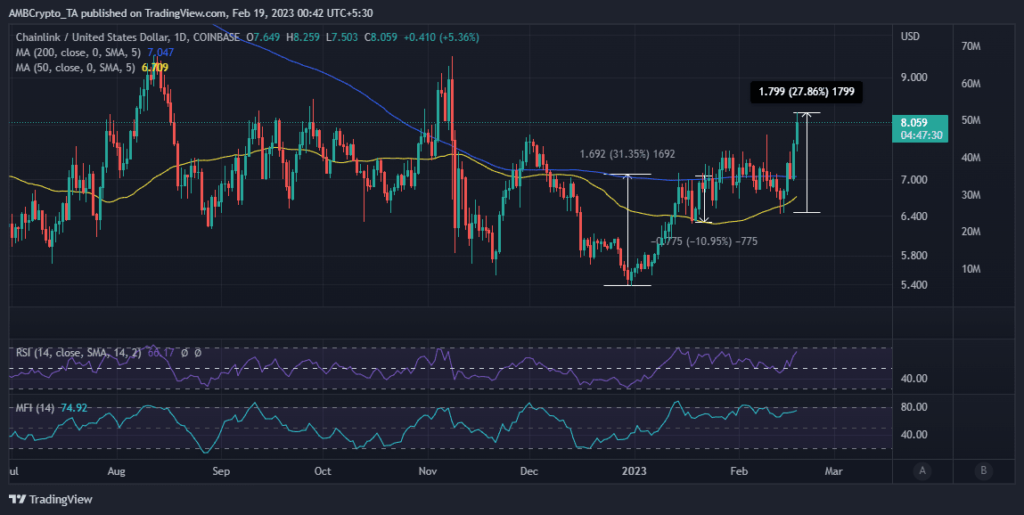 Additionally, the rally kicked off from the RSI mid-range, confirming that the relative energy was nonetheless in favor of the bulls. In different phrases, LINK, at press time, was nonetheless carrying on with the bullish momentum beforehand witnessed in January.