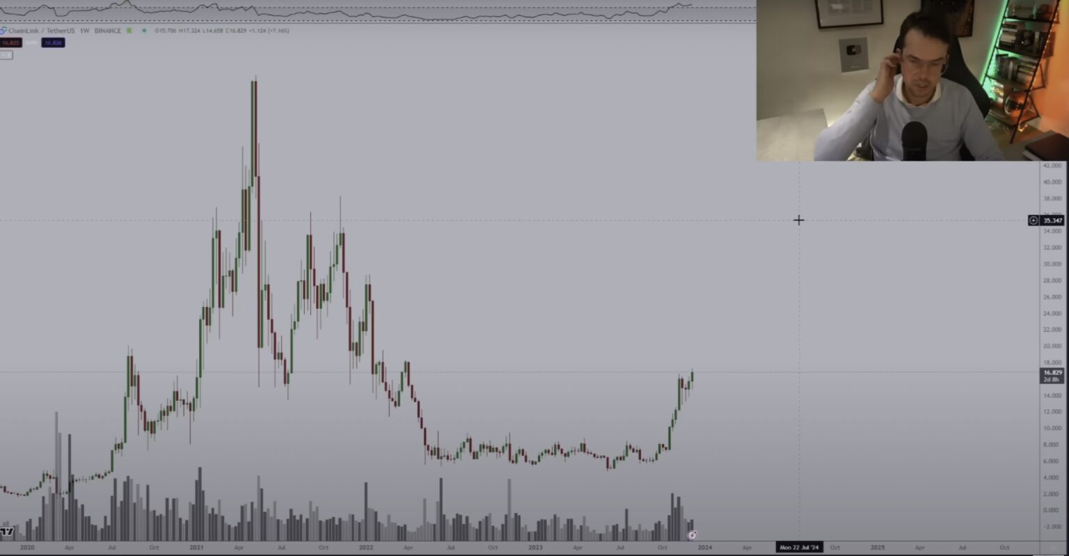 “In 2019-2020, we are able to see that we had substantial breakouts going down already earlier than the [BTC] halving happened, as a result of on this case, Chainlink ran from $1.60 to $5, simply earlier than the Bitcoin halving happened. Now we’re working from $6 to $18, maybe even in the direction of $20, have a correction, after which one other run in the direction of the highs [around $35.34], which implies that you must see energy on Chainlink towards Bitcoin.”