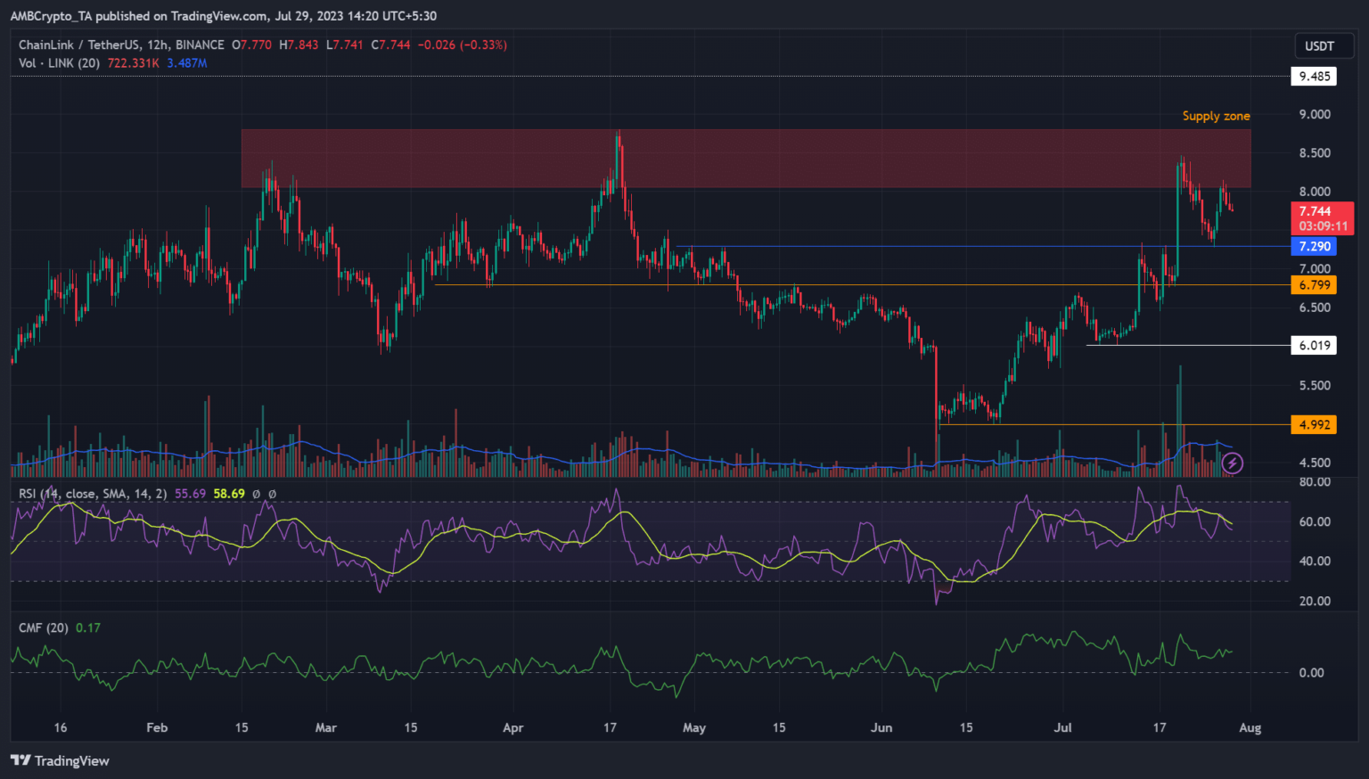 Chainlink [LINK] recovered virtually all of the losses suffered in Q2. The altcoin hiked over 50%, rising from a low of $5 in mid-June to about $7.7 on the time of writing. However value motion has hit a well-known 2023 value ceiling and provide zone.