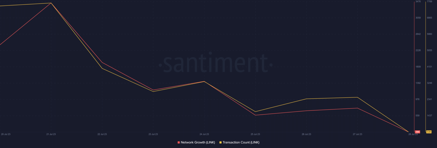 Nevertheless, the rise in accumulation was not sufficient for LINK to keep up its uptrend, as its every day chart once more turned crimson. Moreover, the token’s transaction depend and community progress have additionally plummeted over the previous couple of days.