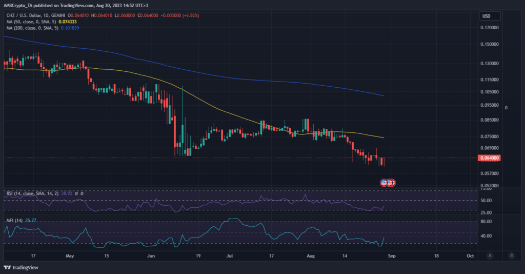 CHZ has been on a bearish trajectory all through August. Actually, it has been on an total downtrend since its peak in November final 12 months. It just lately tanked to a historic low of $0.060 earlier this month. Nonetheless, CHZ bears had been exhibiting indicators of exhaustion on the time of writing.