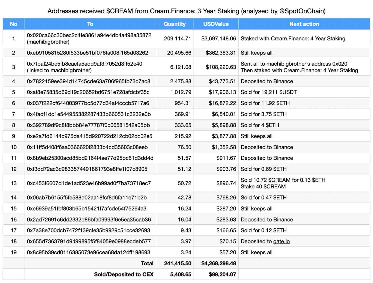 On September 24, Spot On Chain reported that Cream Finance disbursed 241,415 CREAM tokens, valued at $4.27 million, to 19 totally different addresses over the previous 10 hours. Notably, distinguished determine Huang Licheng (generally known as Machi Huge Brother) obtained the lion’s share, acquiring 215,236 CREAM tokens price $3.8 million, and subsequently staked them.