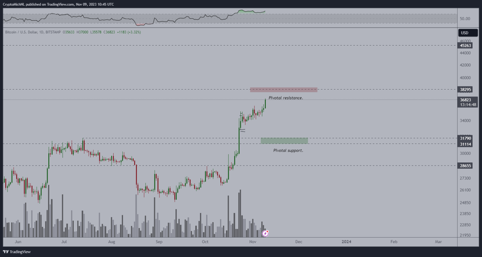 “Bitcoin reaches the next timeframe resistance at $38,000.