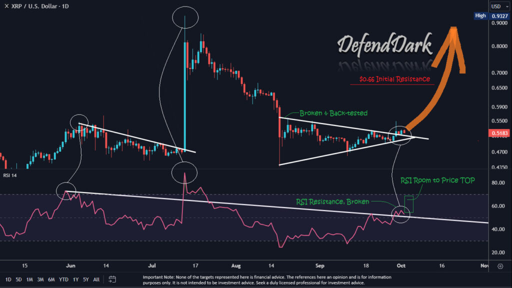The chart offered by Darkish Defender exhibits that on September 29, XRP skilled an upward breakout from an ascending triangle. The XRP worth enhance by 8% was pushed by market individuals’ expectations of Ripple’s Correct Social gathering. Though “main information” did not materialize, the value of XRP nonetheless managed to remain above the development line.