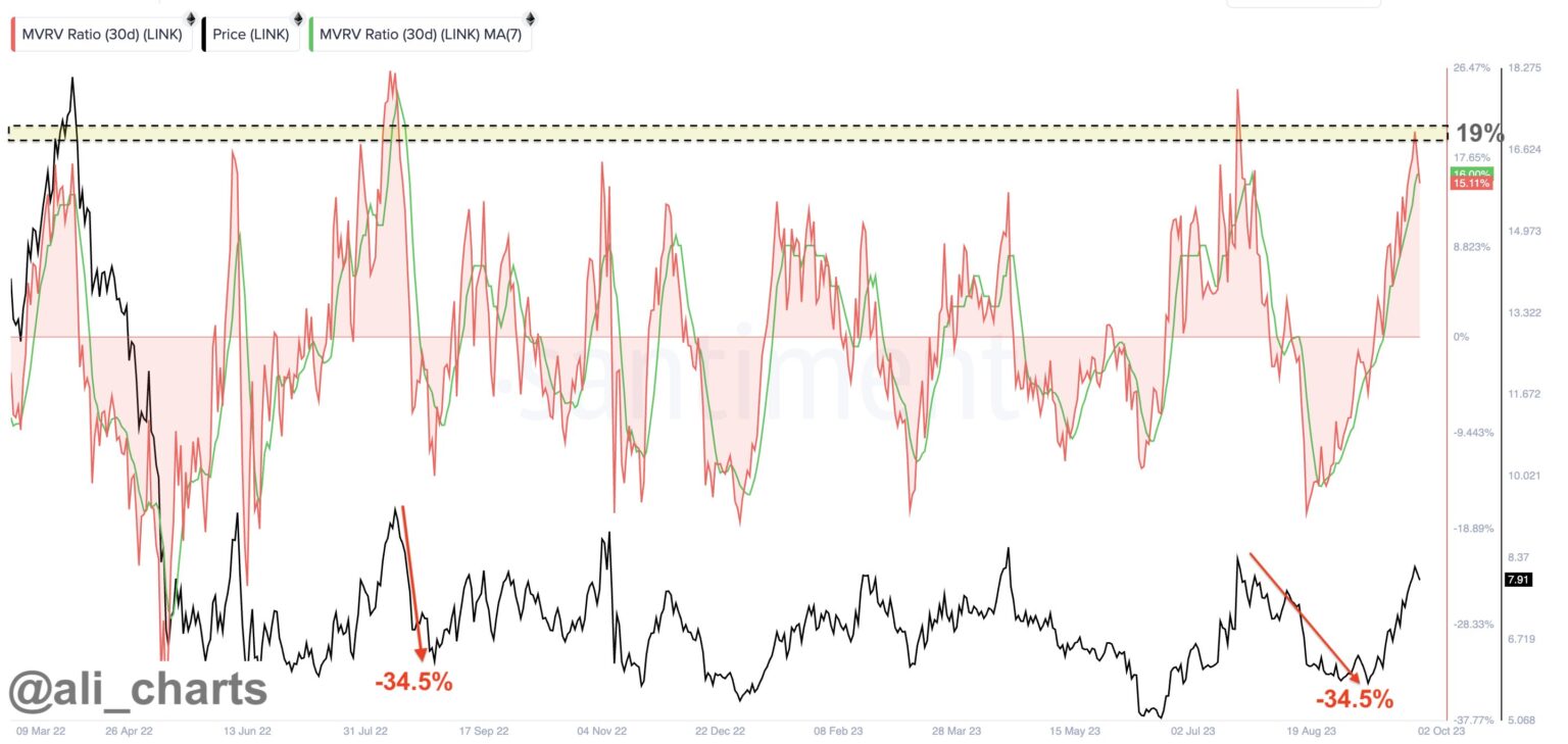 Citing knowledge from crypto analytics agency Santiment, Martinez factors out that the final two occasions LINK’s 30-day market worth to realized worth (MVRV) handed 19%, the asset endured steep corrections. LINK’s MVRV just lately hit 20%.