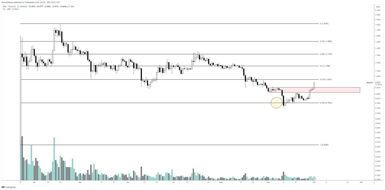 At time of writing, ARB is buying and selling for $0.93, down over 3% within the final 24 hours.