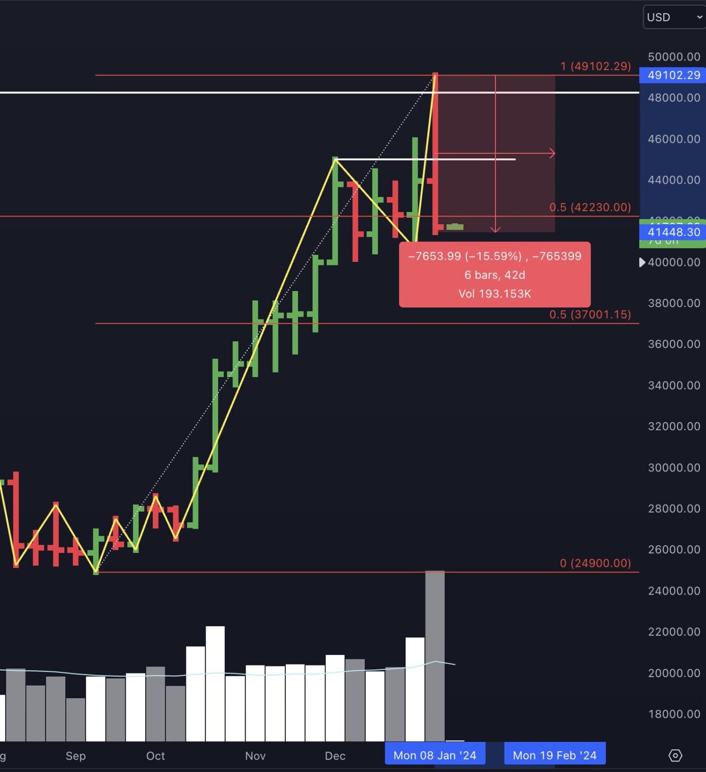 Bitcoin is down 15% from the excessive. The subsequent main draw back goal is the following Gann 50% degree at $37,000.
