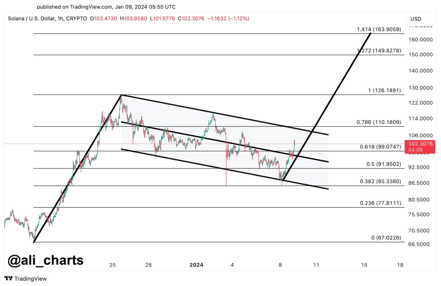 Crypto dealer Ali Martinez tells his 40,000 followers on the social media platform X that Solana (SOL) is forming a bullish continuation sample on the hourly chart.
