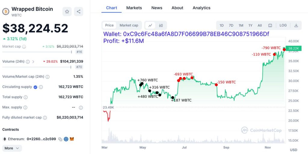 Lookonchain says that the deep-pocketed entity persistently purchased WBTC at low costs and offered greater, making over $24 million in WBTC earnings, with one pockets making $11.6 million and two others making $6.3 million every.
