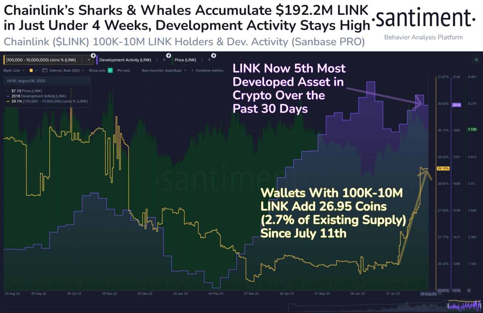 “Chainlink’s GitHub growth exercise has been notably increased this summer time, resulting in the asset cracking the highest 5 most frequent developed property. Moreover, whales and sharks with 100,000-10 million LINK now maintain probably the most cash since December 2022.”