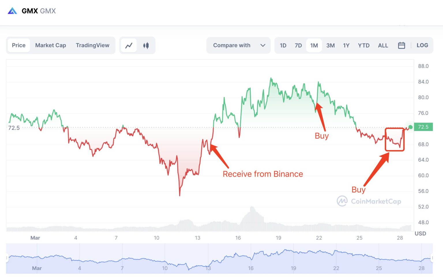 “A SmartMoney who at all times buys GMX at lows and sells at highs purchased 2,993 GMX with 200K USDC at $67 right now.