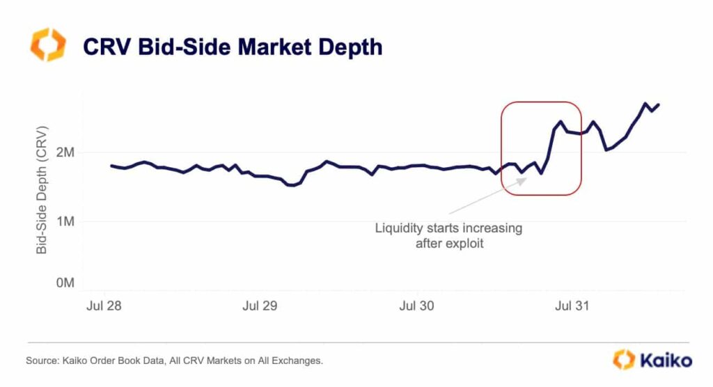 In a current knowledge report by Kaiko, it was revealed that as information of the Curve Finance hack unfold, there was a noticeable rise in bid-side liquidity on centralized exchanges. Bid-side liquidity refers back to the whole quantity and depth of purchase orders out there at completely different worth ranges for CRV, indicating the eagerness of patrons to accumulate the cryptocurrency at numerous market costs.