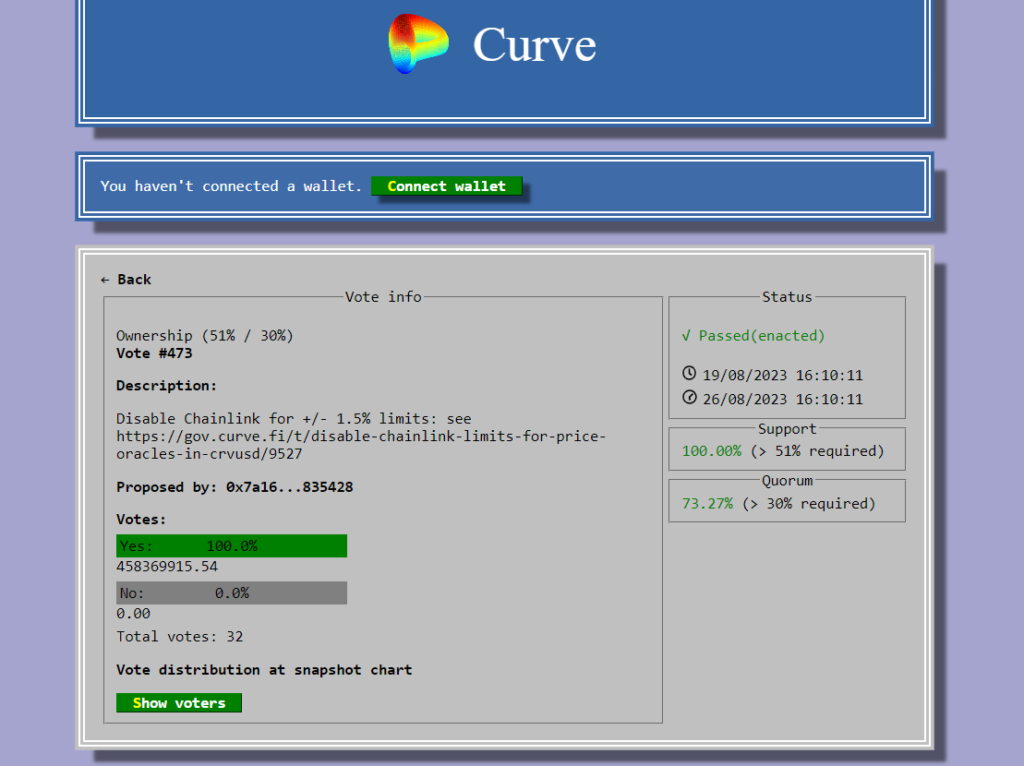 The important thing tenet of the accepted proposal includes eradicating the prevailing ±1.5% protected restrict for the Chainlink value inside the oracle crvUSD system. Below this adjustment, if the Chainlink value considerably deviates from the interior oracle EMA (Exponential Shifting Common) by greater than the required restrict, the Chainlink knowledge supply can be engaged immediately. This mechanism seeks to offer a safeguard towards excessive value fluctuations which may in any other case end in pointless monetary losses for customers.